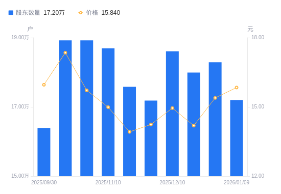 日期A股户数(户)流通A股户均持股数(股)户均持股市值(万元)2026-01-0917197411074.5717.542025-12-3118291210412.3216.022025-12-1917991510585.7715.022025-12-1018605410236.4815.302025-11-2817183311083.6615.782025-11-2017581710832.5015.082025-11-1018689710190.3115.282025-10-3118921610065.4215.822025-10-1018922110065.1517.462025-09-3016394211617.1518.54
