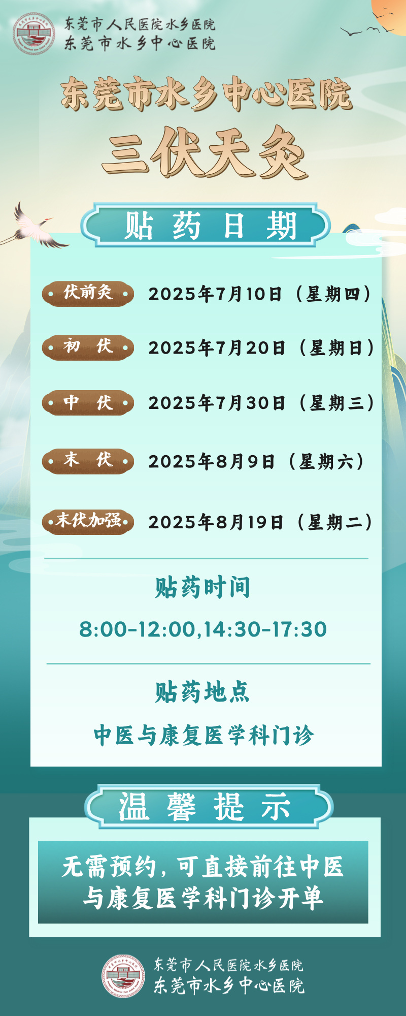 三伏是一年之中气温最高天气最热的时间段,阳气旺盛,人体处于阳气生发渐旺,体内寒凝之气易解的状态。借用天之阳、地之阳、人之阳最旺盛的“三伏”驱散寒湿之邪是中医传统养生、治病的绝好契机。东莞市人民医院水乡医院(东莞市水乡中心医院)利用特制的辛温膏药贴敷在相应的穴位上或艾灸相应的部位以激活人体的脏腑经络气血,激发身体阳气,辅助调节体质,适用于传统中医理论中寒湿体质的调理,作为季节调理的保健方式,对部分人群的体质有改善作用。