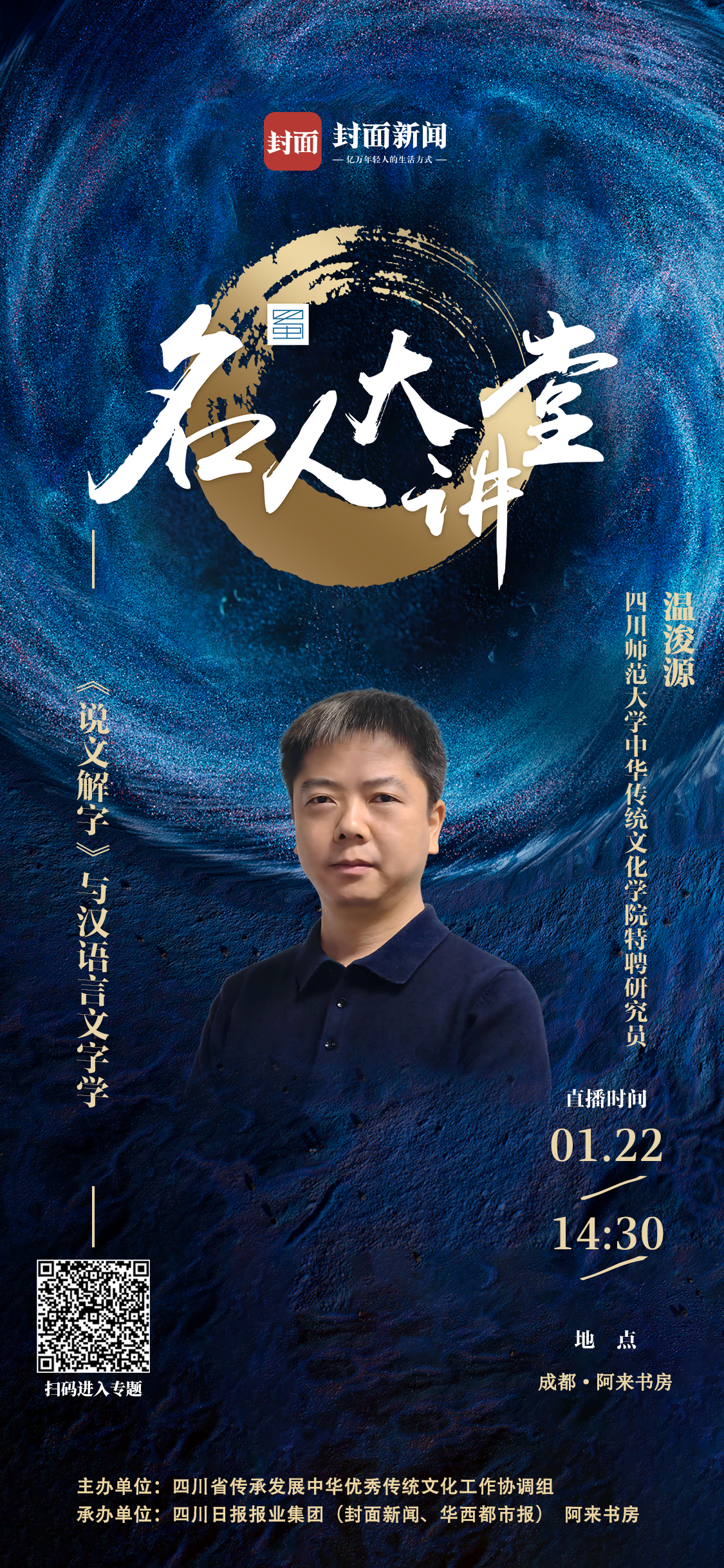名人大讲堂自2018年11月首次开讲以来,已成功举办76场讲座,邀请全国多学科专家围绕四川历史名人和巴蜀特色文化展开分享,吸引超一亿人次观看直播。本次讲座也将在封面新闻、川观新闻、四川观察、四川发布等平台同步直播,线上观众可以走进直播间,跟随温浚源一起领略《说文解字》的魅力。