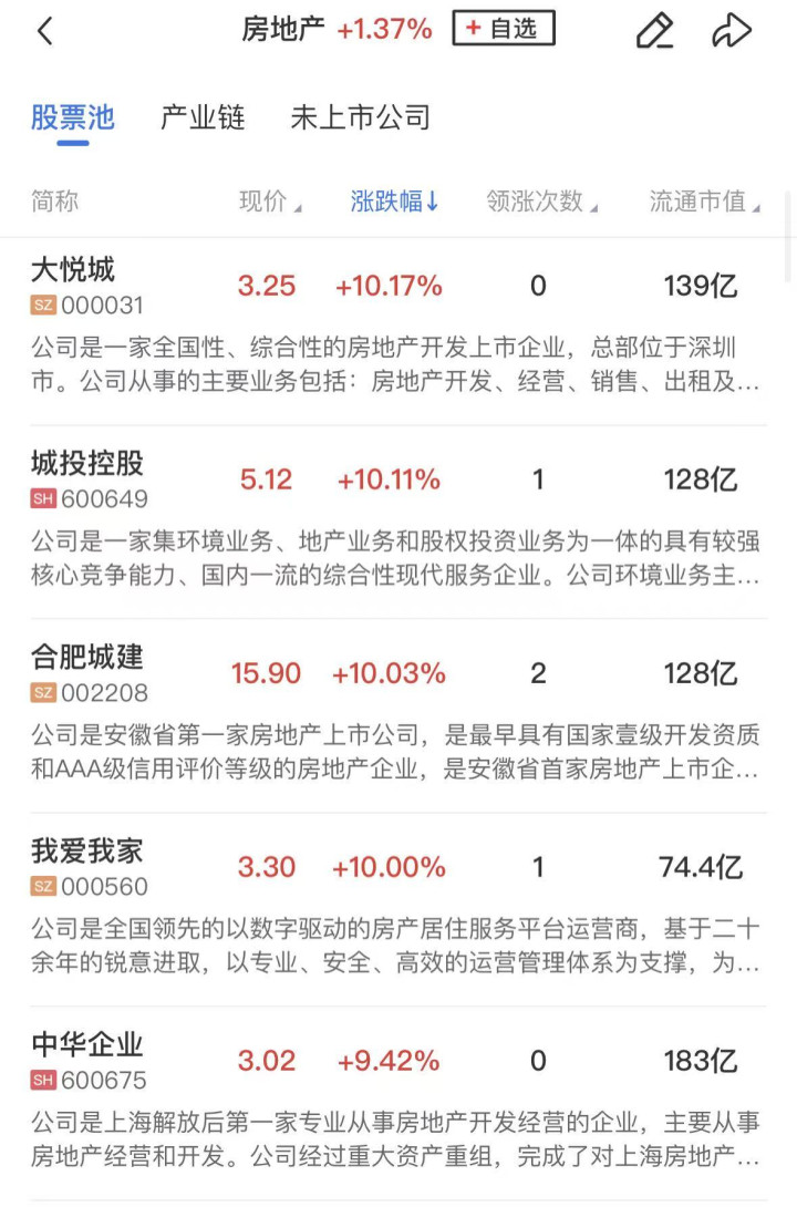 板块上,房地产板块涨幅居前,城投控股、合肥城建、大悦城涨停,招商蛇口、滨江集团、渝开发等个股涨幅居前。
