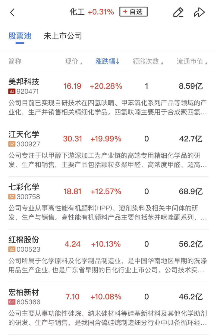 化工板块逆势拉升,江天化学、红宝丽、山东赫达、宏柏新材、维远股份、红墙股份涨停,新乡化纤、阿拉丁、润丰股份等个股涨幅居前。